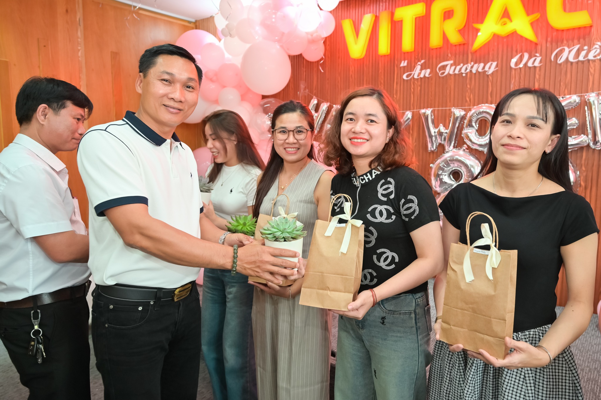 VITRACO đã dành tặng chị em phụ nữ những chậu sen đá nhỏ xinh như một món quà ý nghĩa. Sen đá tuy nhỏ bé nhưng có sức sống bền bỉ, luôn vươn lên mạnh mẽ dù trong điều kiện khắc nghiệt.Tham dự chương trình có bà Võ Thị Ước – thân sinh của Chủ tịch HĐTV kiêm Tổng Giám Đốc VITRACO anh Ngô Tấn Nhị.Do công tác xa, Chủ tịch HĐTV kiêm Tổng Giám Đốc VITRACO gởi 1 chậu hoa gởi đến các chị em công ty.1 chậu sen đá cùng 1 món quà đặc biệt được gởi tặng đến bà, các chị em trong công ty.Các phần quà gởi tặng các chị em phòng Kế toán.